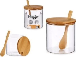 Suikerkom / Suikerpotje Glas Met Bamboe Houten Lepel En Deksel 520 ML