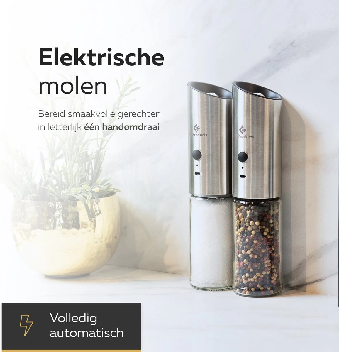 โถ Gravitity Operationโข- simpel & efficiรซnt โ Met de elektrische peper- en zout set van 101Products maak je het jezelf gemakkelijk tijdens รฉn na het koken. Automatisch malen in letterlijk รฉรฉn handomdraai: nooit meer draaien, alleen nog omkeren.