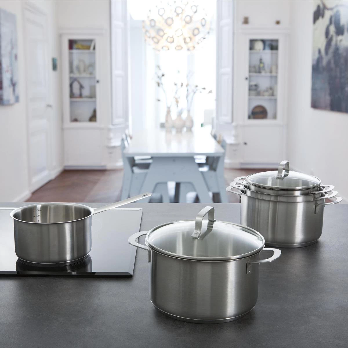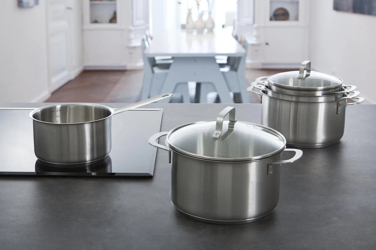 De gesatineerde roestvrij edelstalen body loopt loodrecht omhoog en mondt uit in een strakke rand. Door deze schenkrand kun je eenvoudig vloeistoffen afgieten. De strak afgeronde grepen en stelen zijn vuurvast, liggen prettig in de hand en zorgen voor een veilige grip tijdens het koken.