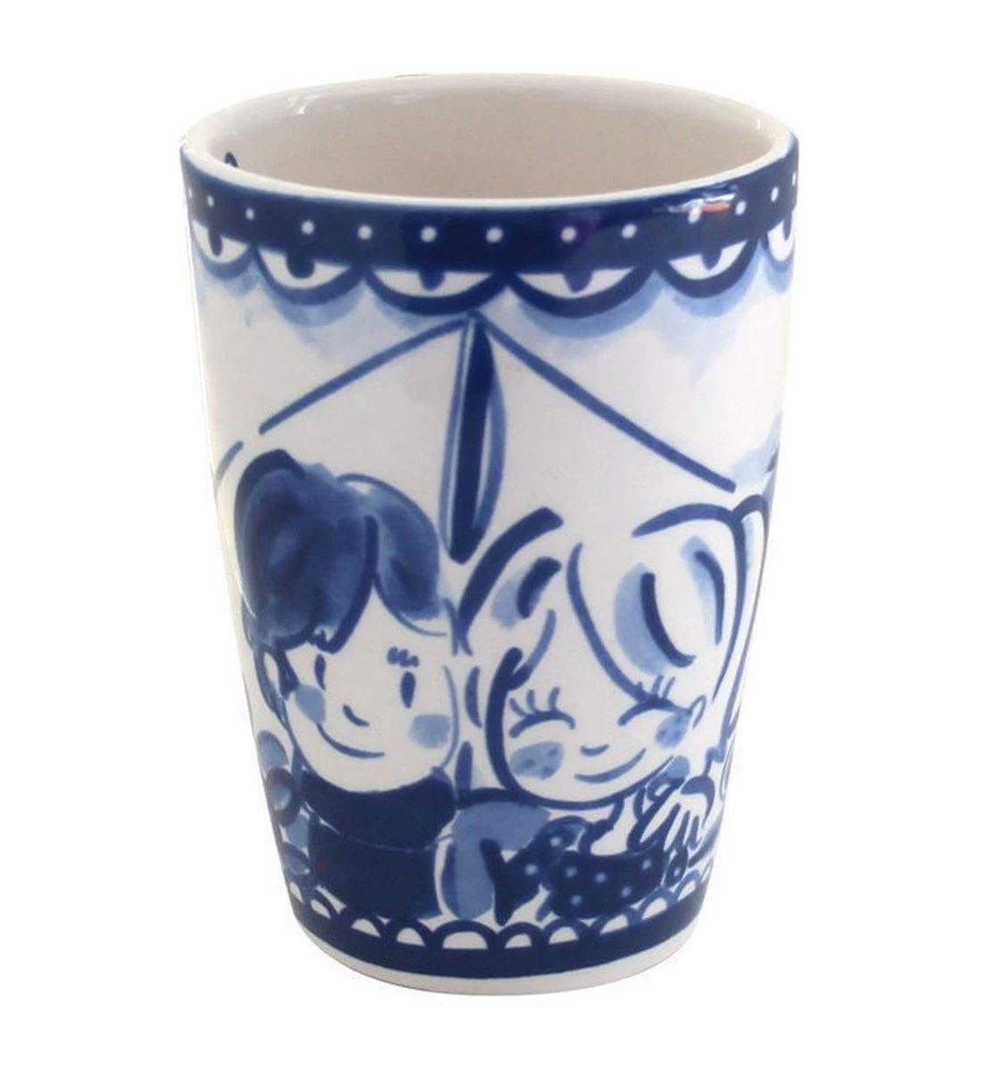 Deze beker XL van Blond Amsterdam komt uit de collectie Delfts Blond. Deze vrolijke beker is 13,5cm hoog, heeft een doorsnee van 9,5 cm en maar liefst een inhoud van 0,5 liter. De beker is van aardewerk en magnetron- en vaatwasmachinebestendig.
