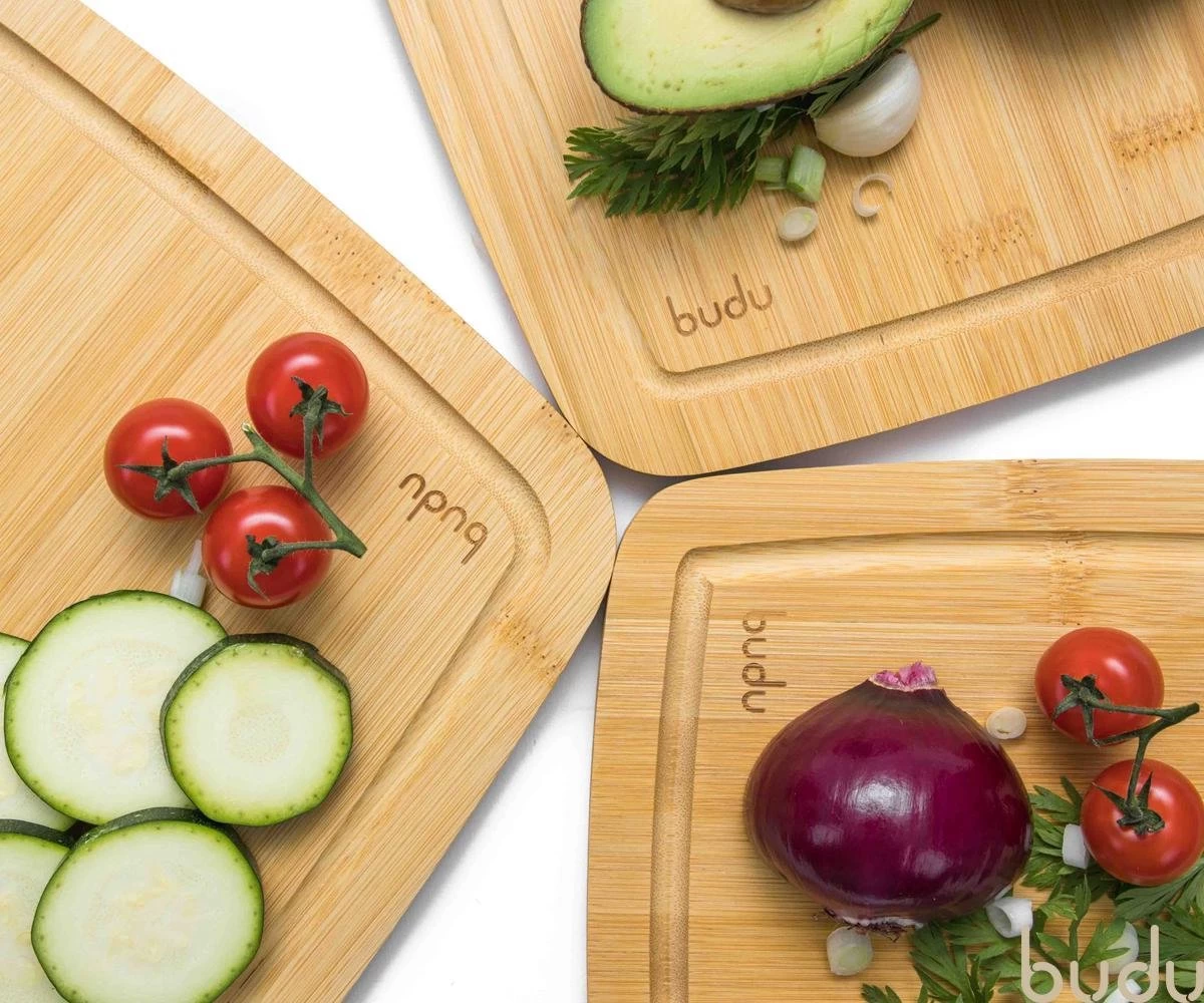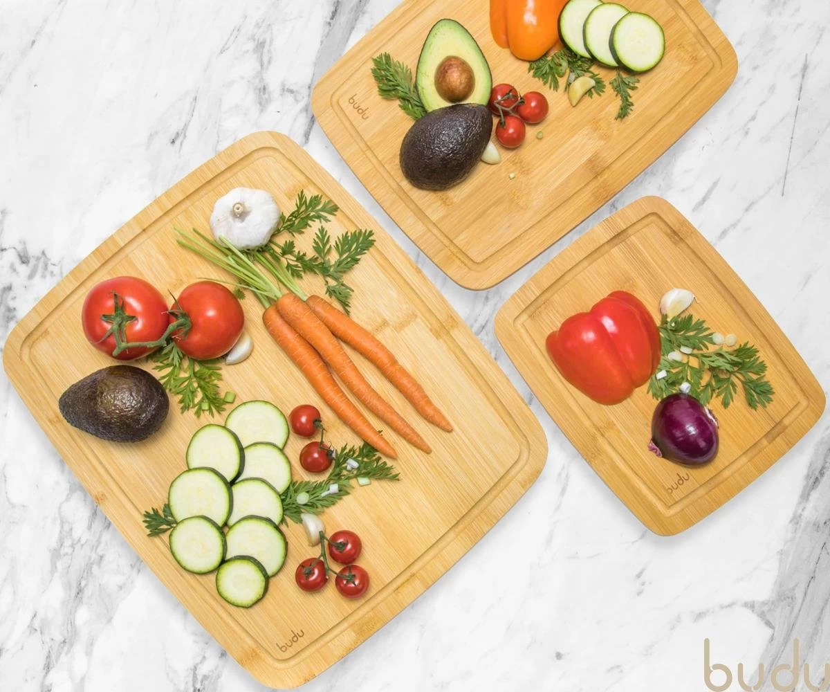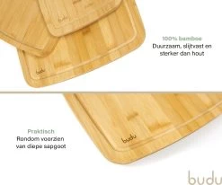 De snijplankenset van Budu bestaat uit 3 verschillende snijplanken. Zo kun je hygiรซnisch je ingrediรซnten snijden. Alle drie de snijplanken zijn gemaakt van bamboe. Bamboe is een zeer sterk en slijtvast materiaal. Daarnaast heeft het een luxe uitstraling. Alle drie de bamboe snijplanken zijn aan รฉรฉn zijde voorzien van een saprand, waardoor het sap van uw groenten of vlees niet op uw aanrechtblad komt.