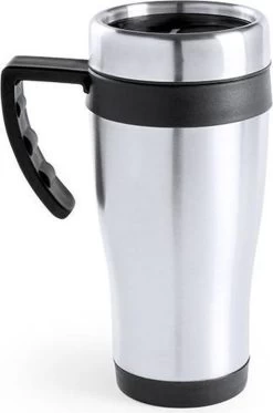 2x stuks rVS thermosbeker/warm houd/isoleer beker zwart 500 ml. Een zilveren thermosbeker met zwarte accenten, gemaakt van dubbelwandig RVS met kunststof. De thermosbeker heeft een hoogte van 18 cm en een diameter van ca. 8,5 cm. Inhoud: 500 ml. Niet geschikt voor in de vaatwasser en magnetron. Reisbekers.