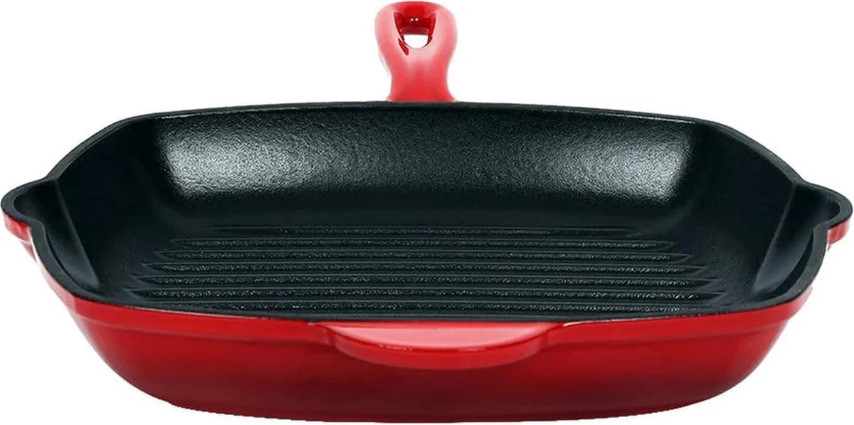 Grill overheerlijke kip of diverse vlees met deze gietijzeren grillpan. De vierkante grillpan heeft een afmeting van 28 x 28 cm en is uitgevoerd in rood. Een zeer gewilde kleur bij gietijzeren pannen.