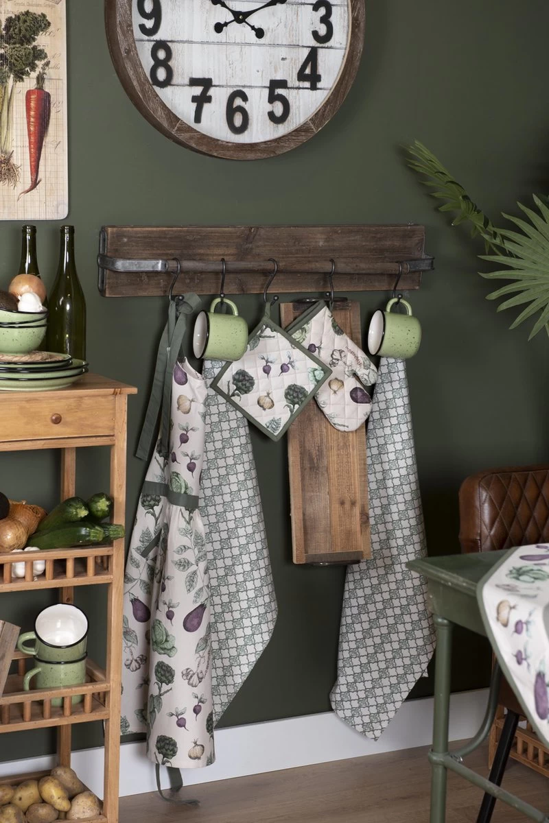 Een serie die een vleugje nostalgie toevoegt. De prachtig geïllustreerde verschillende soorten groenten doen je denken aan de moestuin. De matchende offwhite achtergrond versterkt de gedetailleerde vormgeving en kleuren van de groenten. Ook het groene patroon is een ontzettend fijne toevoeging aan deze collectie. Zowel voor de keuken als op tafel zijn er voldoende artikelen verkrijgbaar die zorgen voor een sfeervolle (leef)keuken. Denk hierbij aan keukenschorten, tafelkleden, keukendoeken, ovenhandschoenen, pannenlappen en broodmandjes.