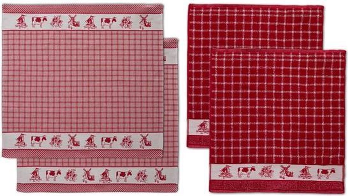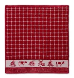 Molens, koetjes en boten. Het dessin Dutchie van DDDDD bestaat uit oer-Hollandse afbeeldingen in de border op een traditioneel rood geruite doek.