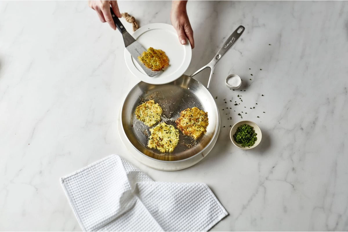 De Industry pannenkoekenpan is een echte aanrader voor de hobbykok. Ook al heeft deze pan geen antikleefl aag, toch is ze perfect geschikt voor het bakken van heerlijke pannenkoeken. Het 5-lagenmateriaal van 4,8 mm dikte tot aan de rand garandeert een perfecte warmteverdeling en dankzij de lage opstaande rand glijden de pannenkoeken zonder problemen uit de pan. ul