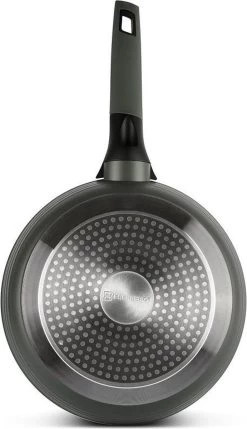 - Gegoten aluminium, met keramische/marmeren coating, ideaal voor aanbraden, en vetarm koken