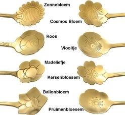 Een set van 8 lepeltjes in de vorm van verschillende bloemen. Deze theelepels / koffielepels zijn gemaakt van RVS en en hebben allemaal een verschillende vorm. In het set zitten de volgende bloemen: Zonnebloem, Cosmos Bloem, Roos, Viooltje, Madeliefje, Kersenbloesem, Ballonbloem en de Pruimenbloesem. Dit Fako Bijoux® bloemen set bestaat uit 8 lepeltjes van ongeveer 12cm lang en worden geleverd in een handig opbergzakje.