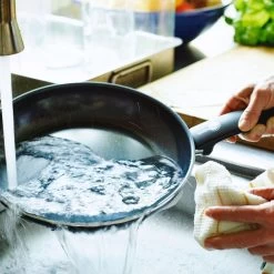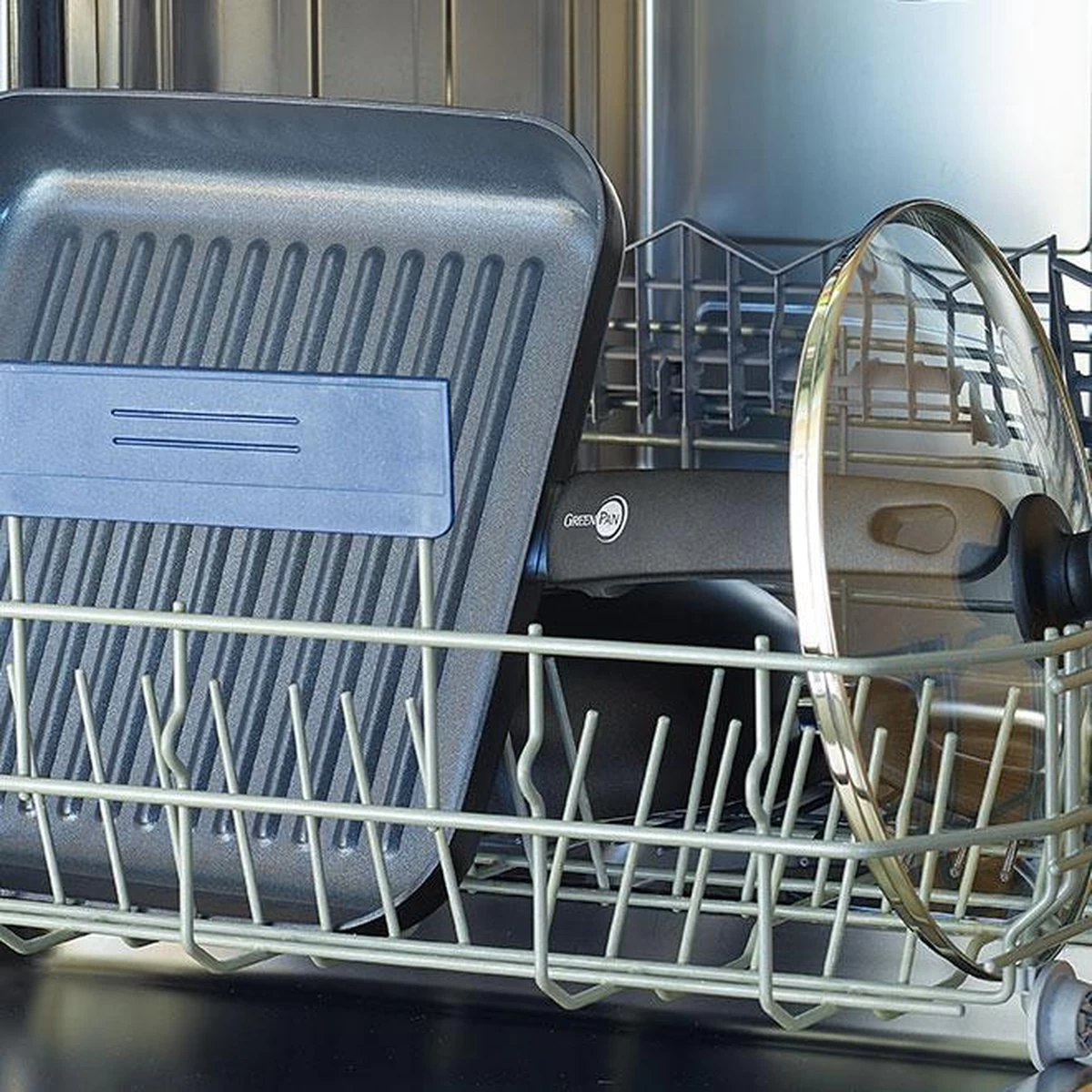โ De grillpan mag in de vaatwasser, maar afwassen met de hand is aanbevolen voor een optimaal behoud van de keramische antikleeflaag.