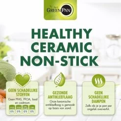 GreenPan is het merk voor iedereen die รฉcht gezond wil koken! Alle potten en pannen hebben een gezonde keramische Thermolonโข antikleeflaag. Die is gemaakt met natuurlijke grondstoffen zoals zand. GreenPan gaat echter nog een stapje verder en gebruikt gรฉรฉn PFAS. Iets wat de meeste merken van antikleefpannen wรฉl nog steeds doen. Met de keramische antikleeflaag van GreenPan ben je dus zeker dat er geen toxische stoffen kunnen vrijkomen, zelfs als je graag kookt op hoge temperaturen.