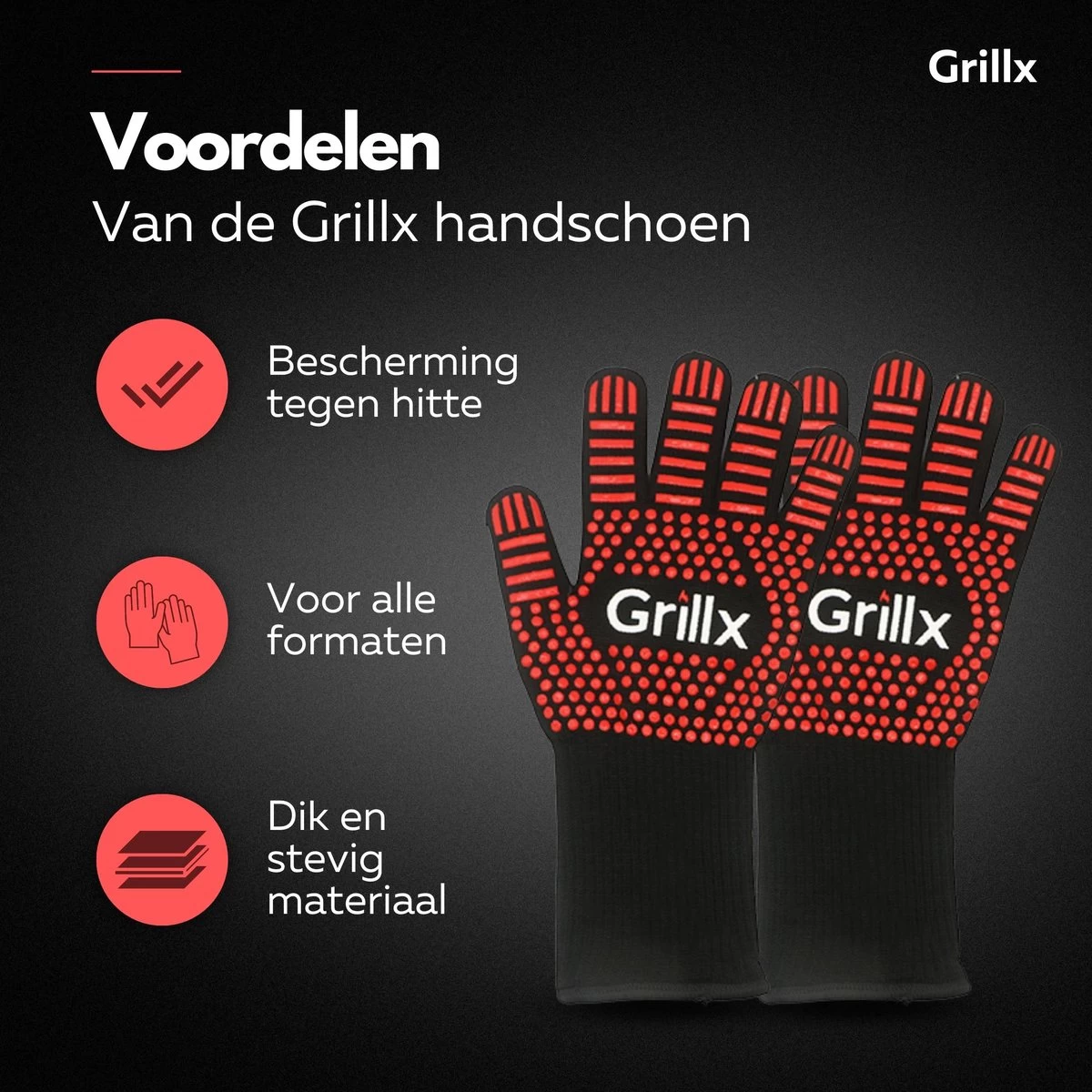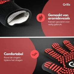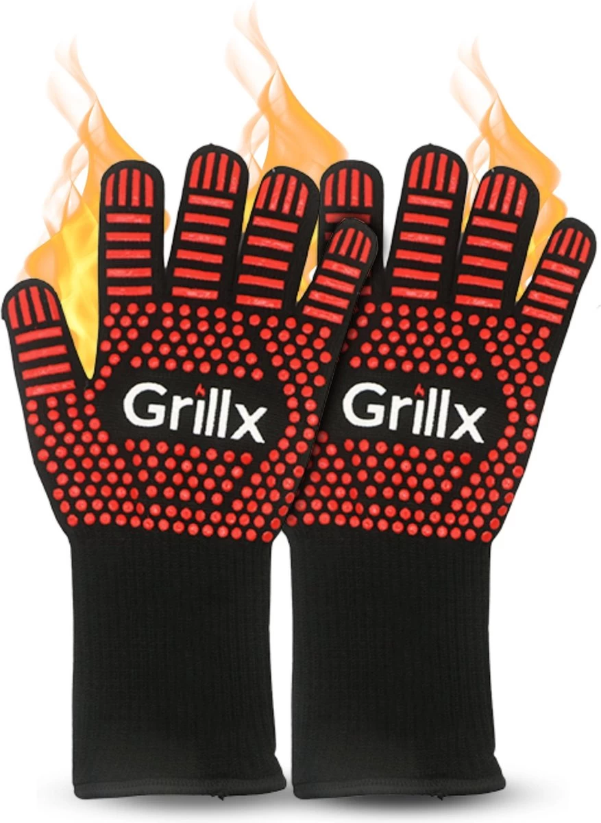De hittebestendige handschoenen van GrillX bieden u een hoge mate van bescherming tegen hitte tot wel 500ยฐC. Gemaakt van hittebestendige aramidevezels en voorzien van het EN407 certificaat, zorgen deze handschoenen ervoor dat uw handen veilig zijn tegen de hitte. De katoenen voering binnenin de handschoenen zorgt voor extra zachtheid en comfort.