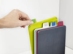 De snijplanken uit de โINDEX โ serie van Joseph Joseph onderscheiden zich omdat de kleuren van de snijplanken overeen komen met de hygiรซne codes. Door vis, vlees, kip, groentes en brood op verschillende snijplanken te snijden voorkom je kruisbesmetting. De snijplanken hebben antislip voetjes en kunnen in de vaatwasser. De Index Joseph Joseph met 4 snijplanken worden in een houder geleverd. De Index snijplanken zijn een sierraad voor uw keukenblad. De snijplanken zijn BPA vrij en vaatwasmachinebestendig.