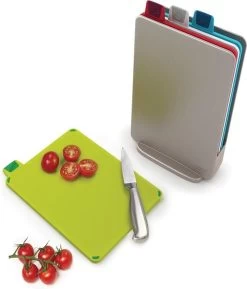 De snijplanken uit de โINDEX โ serie van Joseph Joseph onderscheiden zich omdat de kleuren van de snijplanken overeen komen met de hygiรซne codes. Door vis, vlees, kip, groentes en brood op verschillende snijplanken te snijden voorkom je kruisbesmetting. De snijplanken hebben antislip voetjes en kunnen in de vaatwasser. De Index Joseph Joseph met 4 snijplanken worden in een houder geleverd. De Index snijplanken zijn een sierraad voor uw keukenblad. De snijplanken zijn BPA vrij en vaatwasmachinebestendig.