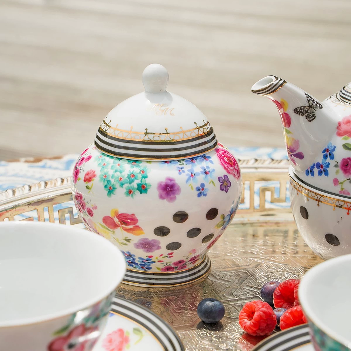 Melli Mello servies geeft elke tafel kleur en gezelligheid. De bloemenprint in combinatie met grafische zwart-wit strepen en gouden accenten geeft dit servies een eigenzinnig en fris uiterlijk en is zowel geschikt voor een moderne woonstijl als een klassiek interieur. Je kunt het servies eindeloos combineren. Fleur je witte servieskast op met de combinatie van zwart-witte polka dots en kleurrijke bloemen. Nodig jouw familie en vrienden uit voor een gezellig avondje tafelen met een prachtig sfeervol gedekte tafel.