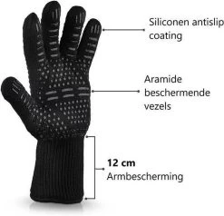 De BBQ en Oven handschoenen zijn bestand tegen extreme hitte tot wel 500 graden Celsius en zijn tevens snijbestendig. De buitenste laag is vervaardigd uit hittebestendige aramidevezels en biedt bescherming bij blootstelling aan extreme hitte, de binnenzijde van de handschoen is gemaakt van zacht katoen en voelt zeer comfortabel, door de antislip silicone strips aan de buitenzijde heb je altijd een superieure grip. De handschoenen zijn perfect voor iedere hete klus: van BBQ tot grillen en van bakken tot ovenwerk!