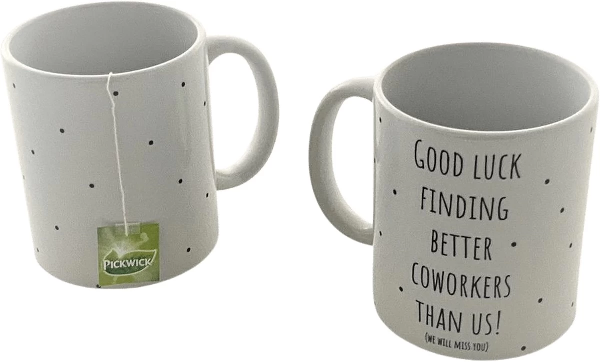 Gaat je favoriete collega jullie verlaten? En ben je op zoek naar een leuk afscheidscadeau voor diegene? Dan hebben wij wat leuks voor jou. Wij bieden een afscheidsmok aan met de tekst: ”Good luck finding better coworkers than us! (we will miss you)”. De keramische mok heeft een inhoud van 300 ml en is dus groot genoeg voor een grote kop koffie, thee of melk.