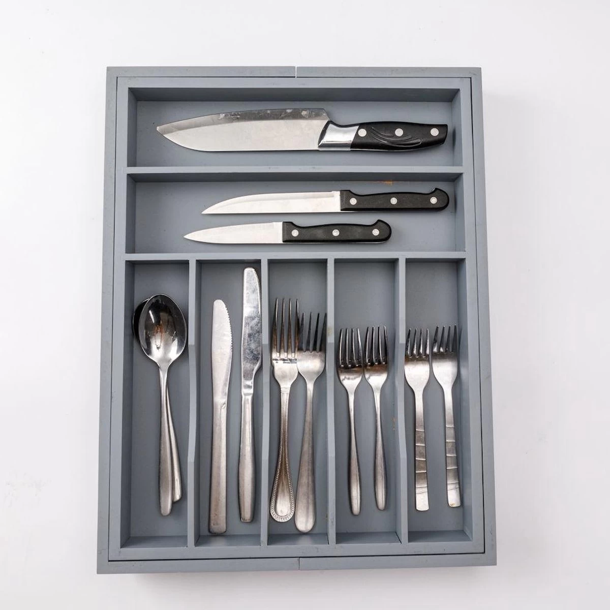 Super handige uitschuifbare bestekbak van bamboe met 7 tot 9 vakken. Ideaal om je keukenlade te organiseren! Kleur: Grijs