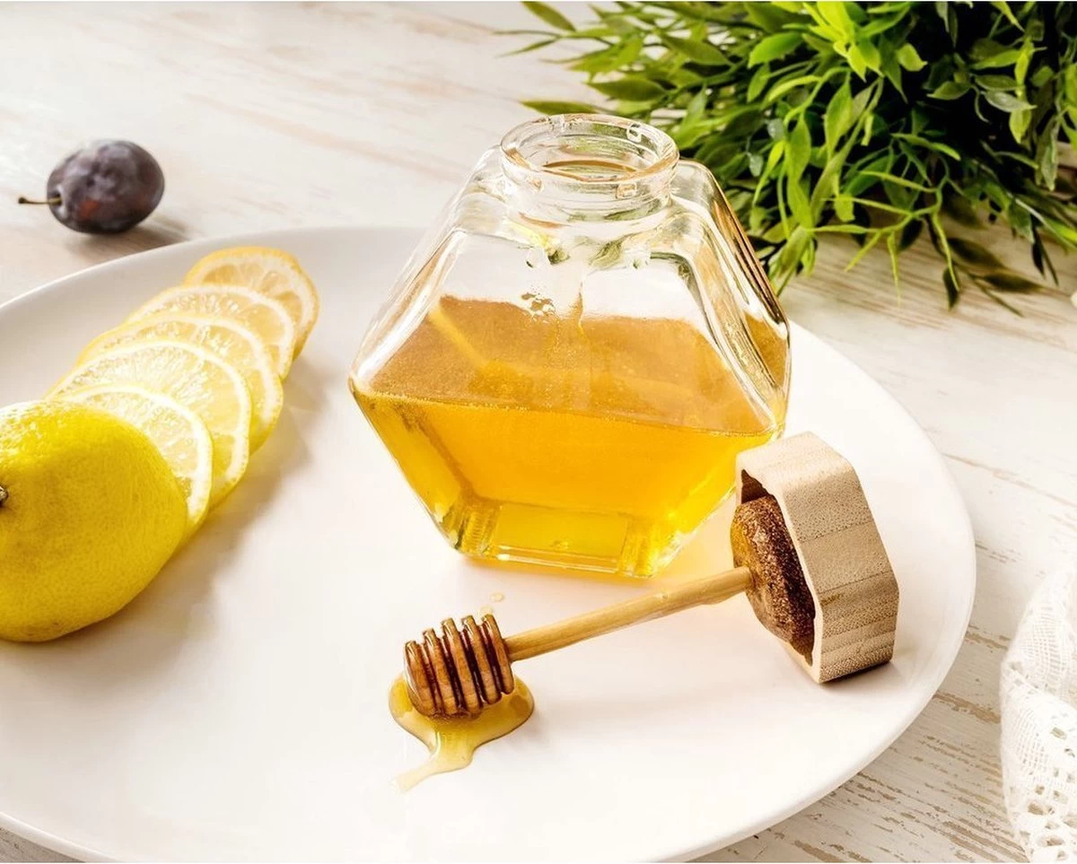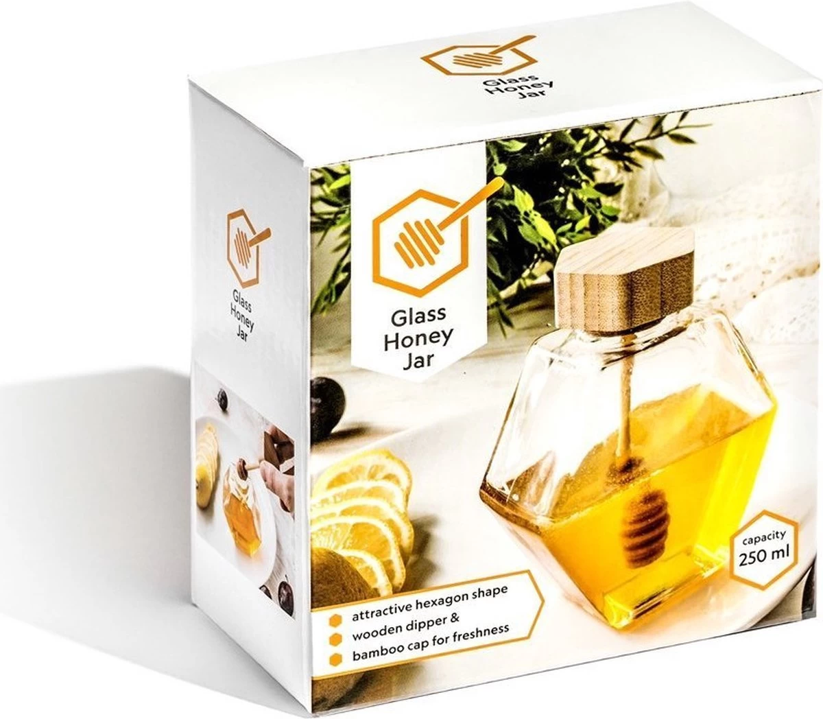 Deze decoratieve glazen honingpot betreft een zeshoekige vorm die doet denken aan een honingraat. De glazen honingpot is voorzien van een speciale houten lepel voor het toevoegen van honing. De honinglepel zit vast aan de houten dop met een kurken afdichting om de honing vers te houden. De honingpot is een leuke en praktische gadget voor alle honingliefhebbers. Wij adviseren de houten delen van de honingpot met de hand te wassen.