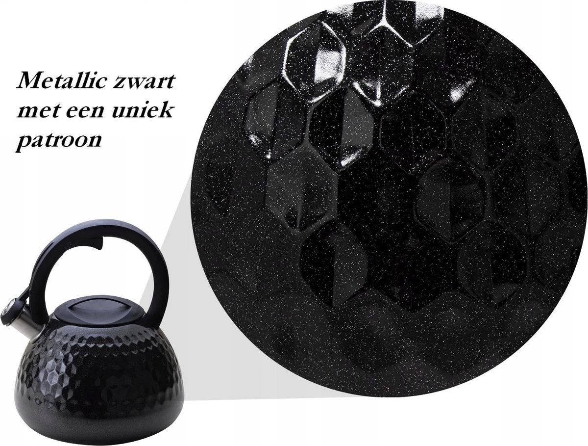 Meyerhoff Fluitketel RVS Metallic Zwart 2.7 Liter – Geschikt Voor Alle Warmtebronnen Ook Inductie – Ruitpatroon – Uniek Design – Koel Blijvend Handvat