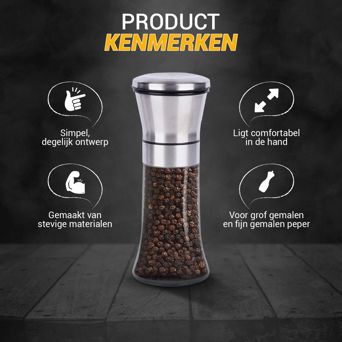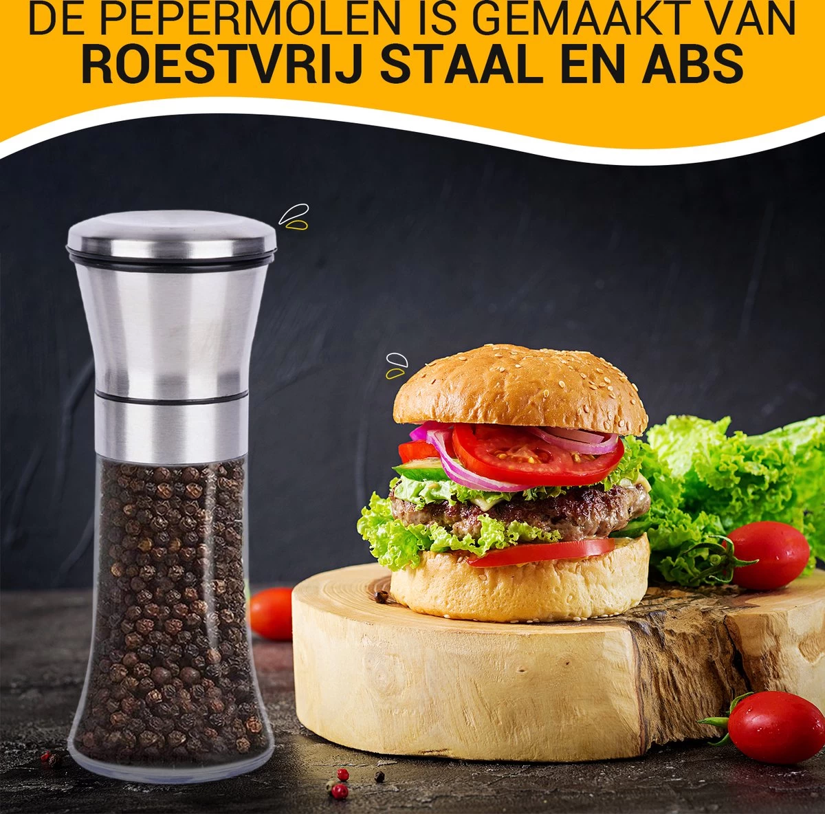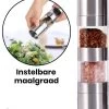 De pepermolen is gemaakt van roestvrij staal en ABS. Daardoor kan die goed tegen een stootje. Je krijgt twee stuks die verpakt worden als een set, waardoor je de andere molen voor bijvoorbeeld zout of witte peper kunt gebruiken.