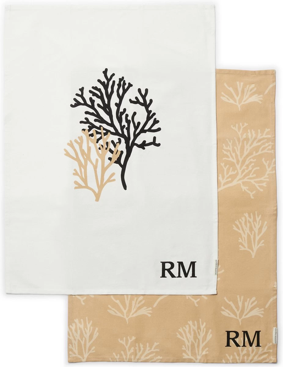 Twee RM Coral Reef theedoeken, waarmee de afwas opeens een stuk avontuurlijker wordt. De off white theedoek is versierd met twee kleuren koraal en het RM-logo. De lichtbruine theedoek heeft overal kleine koraal in de kleur off white en ook het logo van RM.