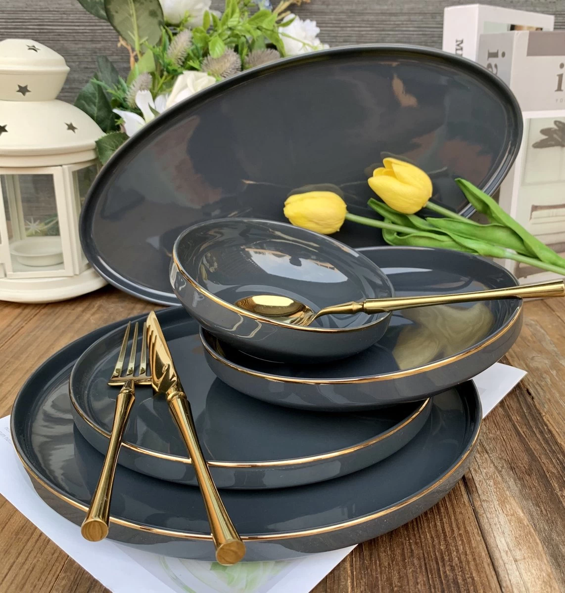 Selinex Porselein Serviesset Grijs Met Gouden Rand 6 Persoons, 25-delig