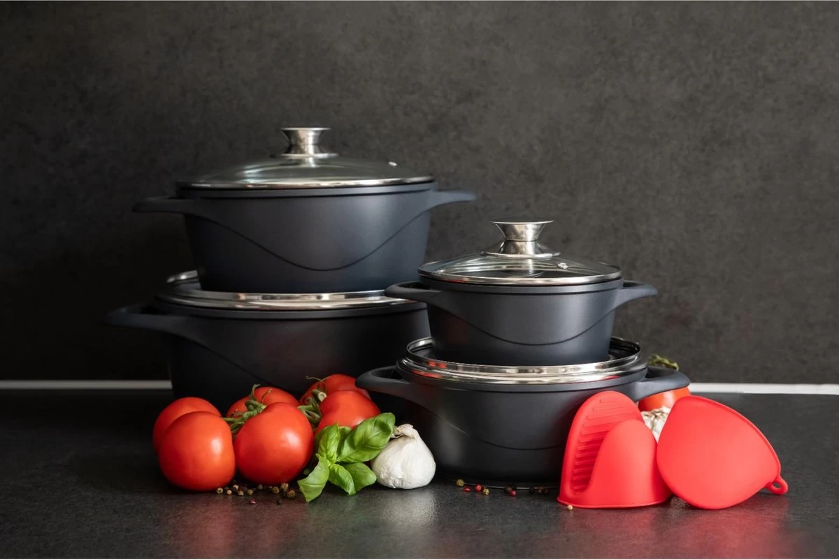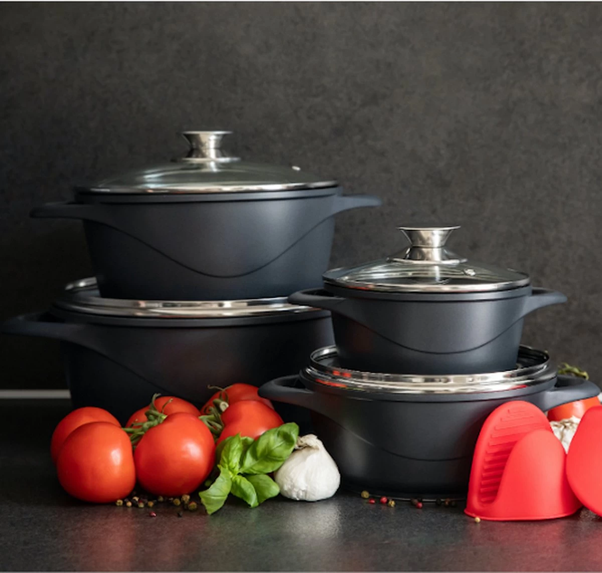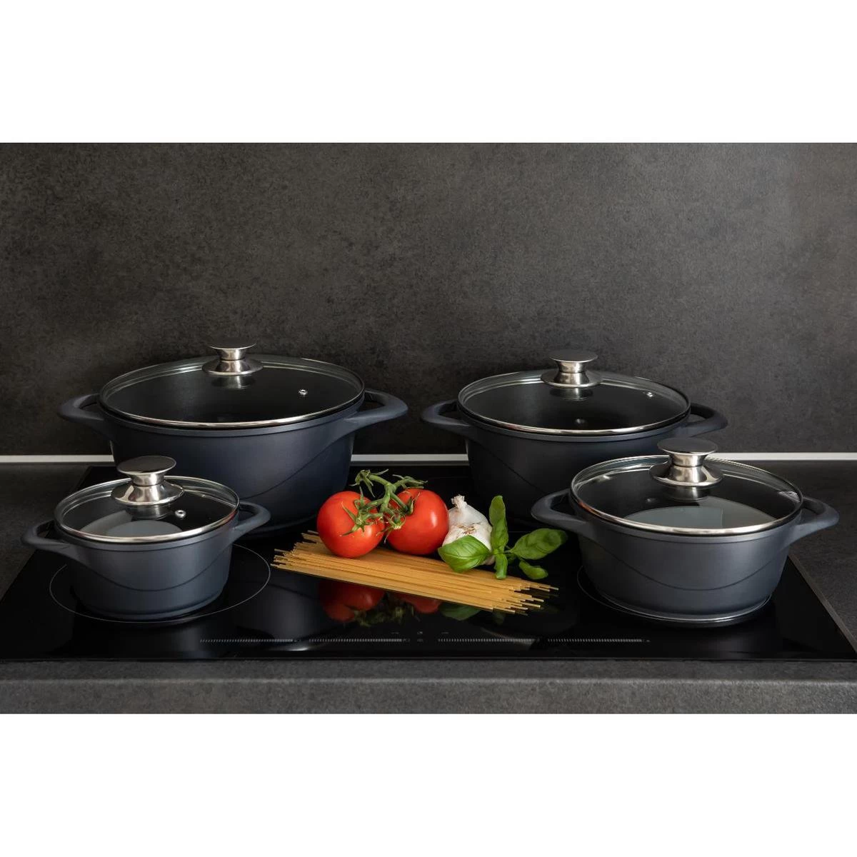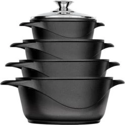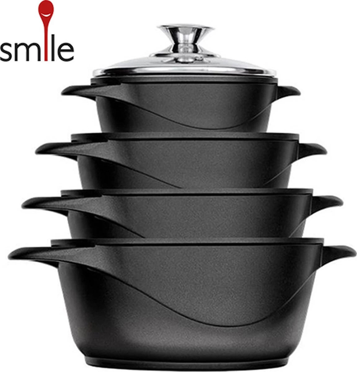 Deze prachtige pannenset van het merk Smile geeft iedere keuken een upgrade. De pannen zijn namelijk geschikt voor iedere kookplaat, waaronder inductie, gas en elektrisch. Ook wanneer jij switcht van huis of keuken kun jij deze pannen dus gewoon blijven gebruiken. Het zwarte materiaal en de glazen deksels zorgen voor een luxe en stijlvolle uitstraling, welke kleur jouw keuken ook is. Naast het mooie uiterlijk zijn de pannen ook nog eens van topkwaliteit; ze zijn allen voorzien van een anti-aanbaklaag, roestvrij stalen knoppen en dikke wanden voor een gelijkmatige warmteverdeling. De perfecte pannenset dus om in te koken, frituren, stoven รณf braden.