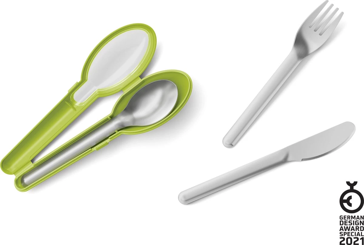 Ideaal om mee te nemen onderweg! De set bestaat uit een lepel, een vork en een mes.