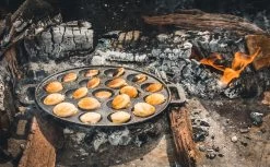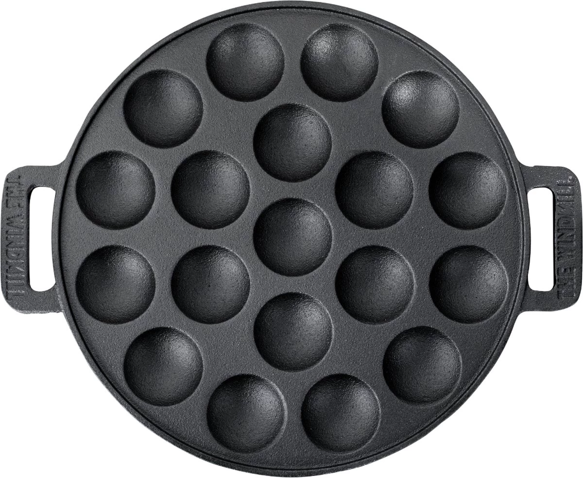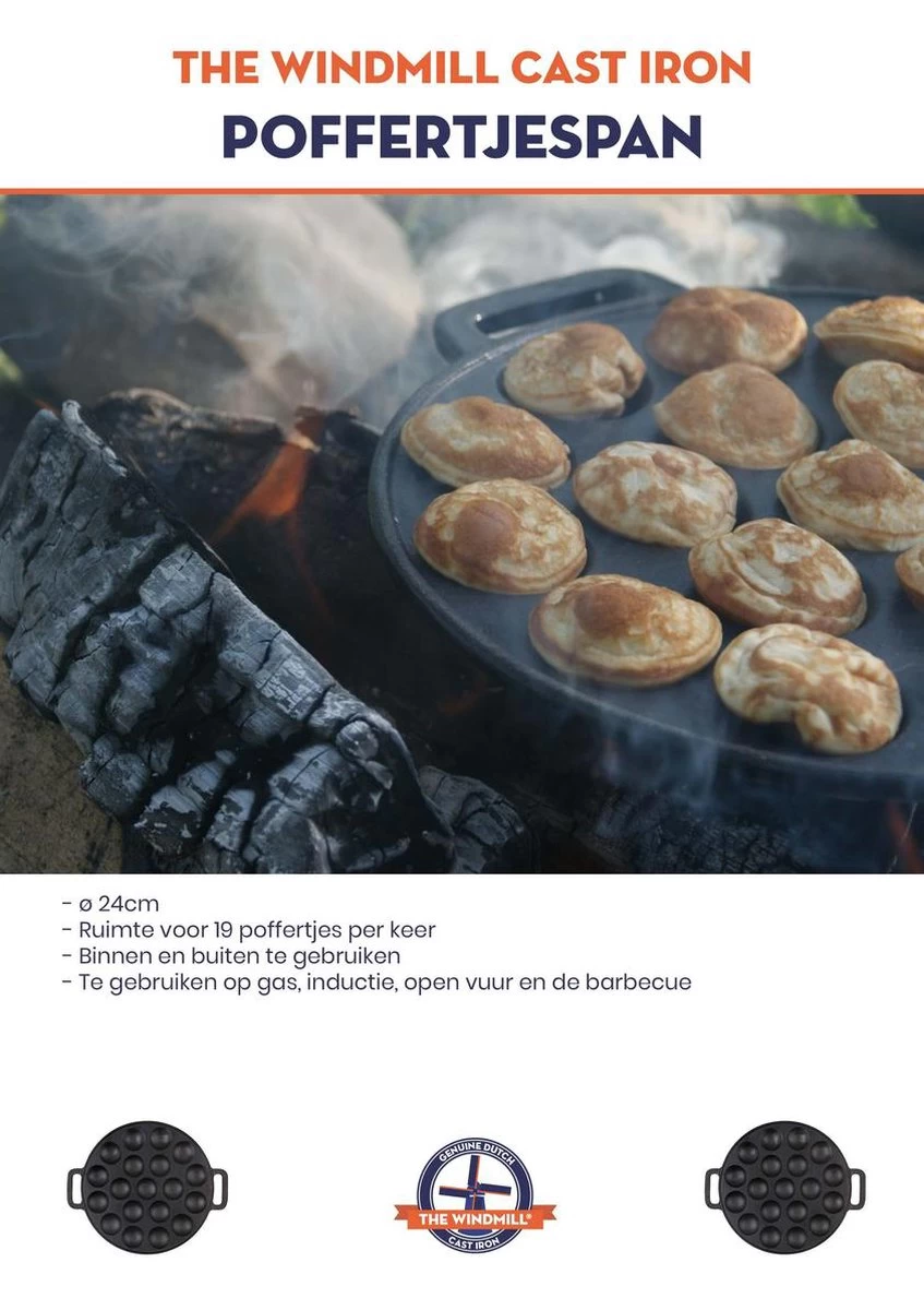 Deze gietijzeren poffertjespan van The Windmill Cast Iron is geschikt voor gas, inductie, open vuur en de barbecue. Een leuke afwisseling voor het buitenkoken. Deze pan is binnen en buiten te gebruiken. Heeft ruimte voor 19 poffertjes per keer. Voor het gebruik moet deze pan wel ingebrand worden.