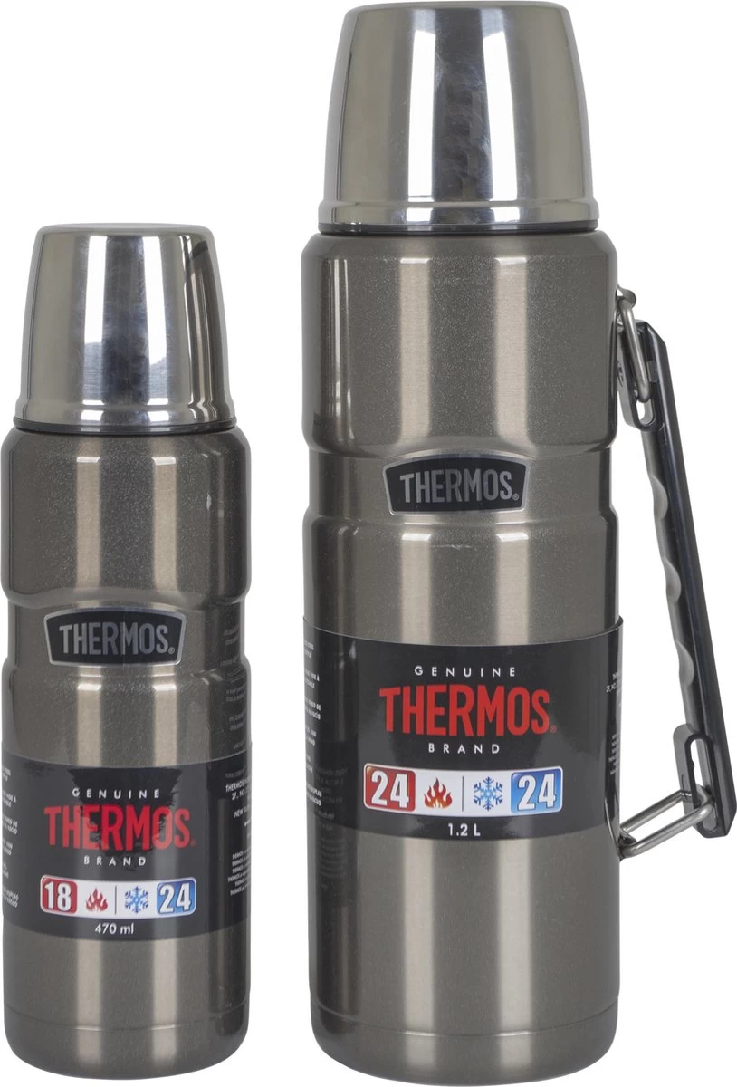 De Thermos King thermosfles heeft een inhoud van 1,2 liter. Dankzij het isolerende staal houdt het dranken voor 15 uur heet of koud. Bevroren dranken blijven zelfs tot 60 uur op temperatuur. De dop kan ook dienen als kopje om de drank gemakkelijk uit te drinken. De fles is uitgevoerd in een prachtige grijze tint.