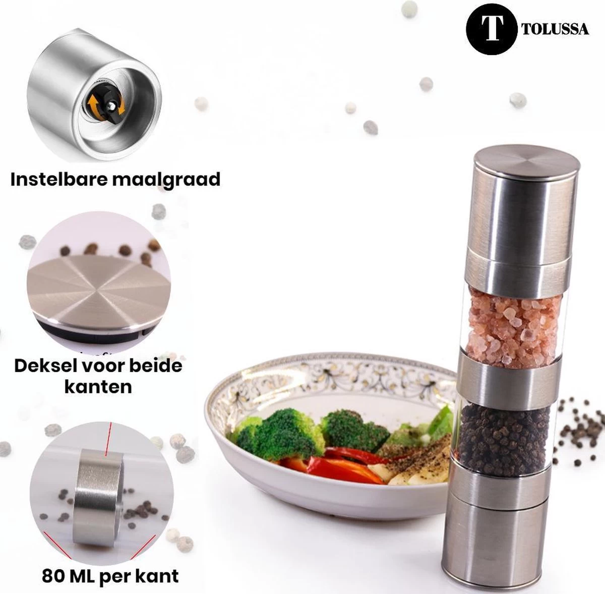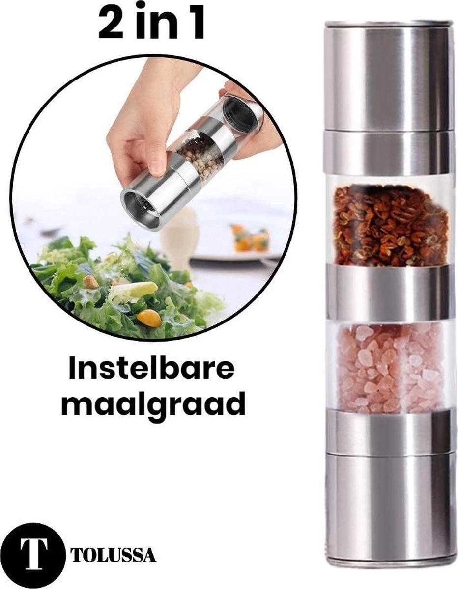 - Alles bij de hand: heb je de pepermolen op de eettafel staan, maar ben je de zoutmolen vergeten? Of andersom? Dit probleem kan niet meer voorkomen omdat de molen zowel peper als zout bevat!