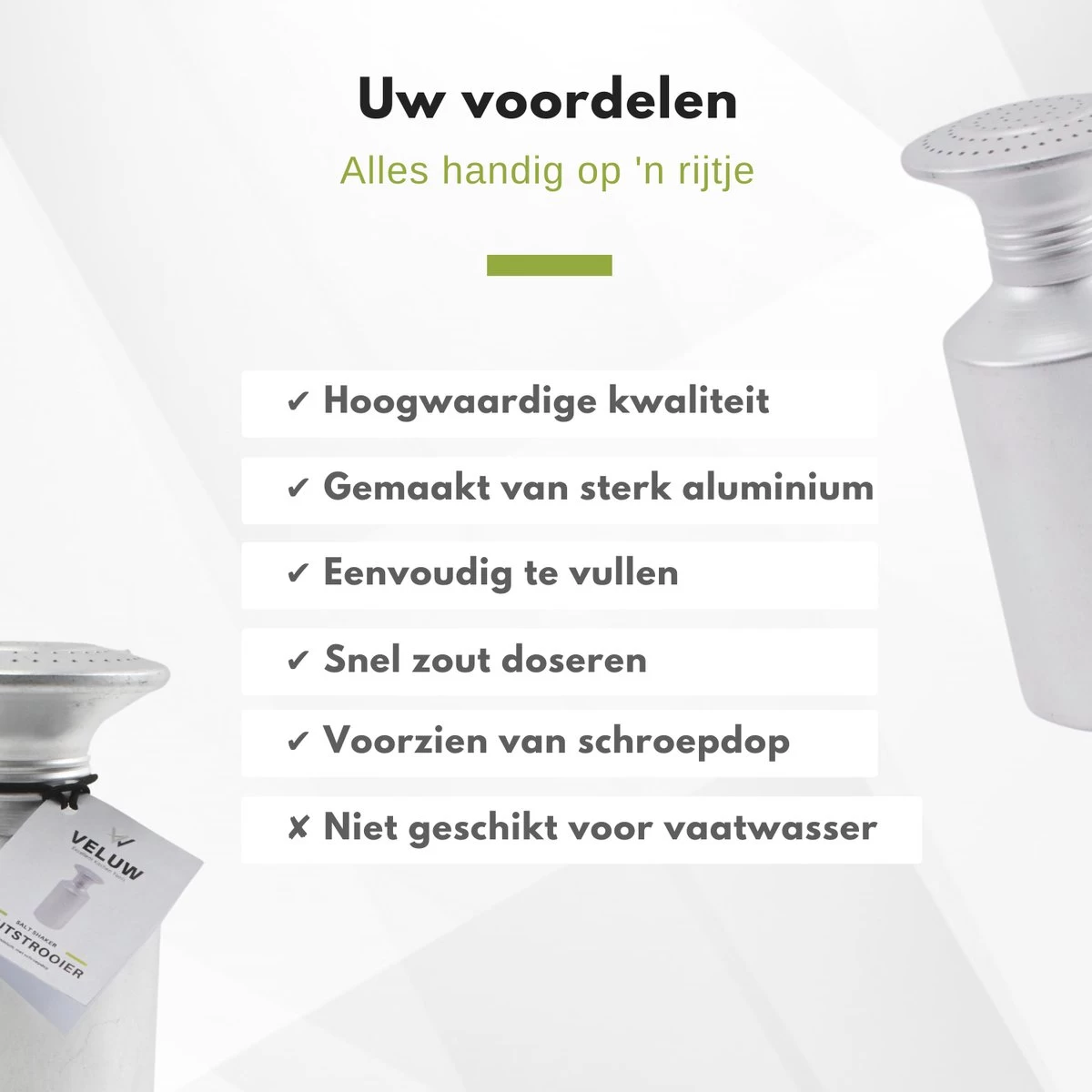 De aluminium zoutstrooier van Veluw is bekend in iedere cafetaria en horeca bedrijven. De strooier is gemaakt van hoge kwalieit waardoor het erg geschikt is voor de professional. Perfect voor het kruiden van frites en gerechten.