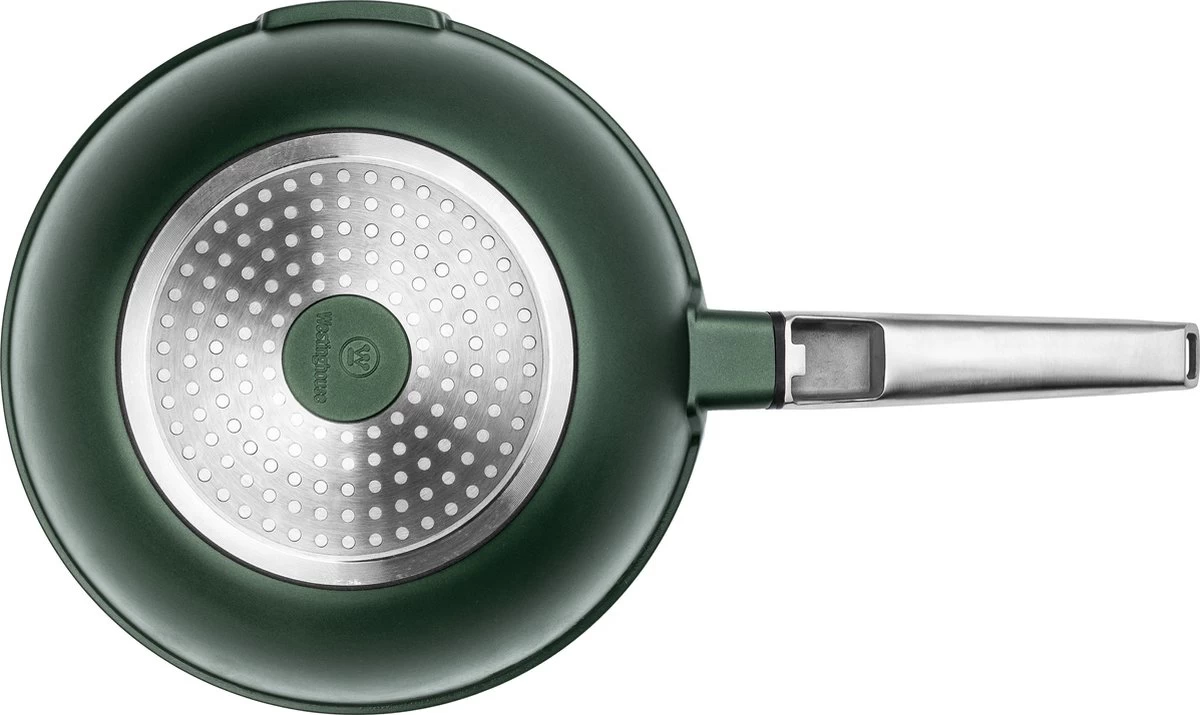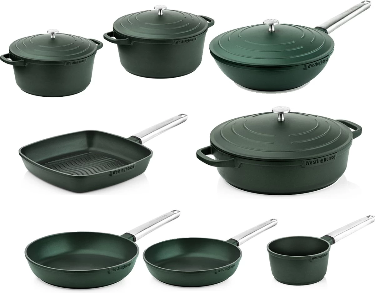 Deze Westinghouse pannenset Performance Series bevat Braadpan 24cm/28cm + Hapjespan 32cm + Wokpan 28cm + Koekenpan 24cm/28cm + Grillpan 28cm + Steelpan 18cm in het groen.