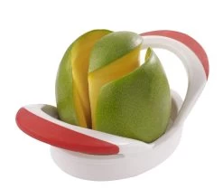 Deze mangosnijder van Westmark snijdt eenvoudig de mango in 2 gelijke delen. Zet de mangosnijder in het verlengde op de mango en duw hem door de mango naar beneden. De pit zal in het middelste deel achterblijven. De softgrip voelt comfortabel en stabiel aan in de hand. De snijder is gemaakt van kunststof en heeft RVS snijbladen. De mangosnijder is na gebruik te reinigen in de vaatwasmachine.